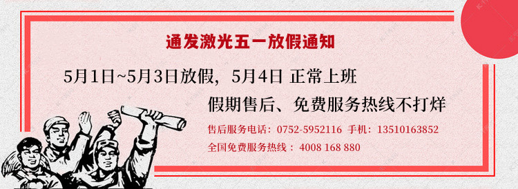 假期預告:通發激光自2022年5月1日起至5月3日放假三天,期間售后服務、全國免費服務熱線暢通,持續為大家提供有力的設備使用保障!